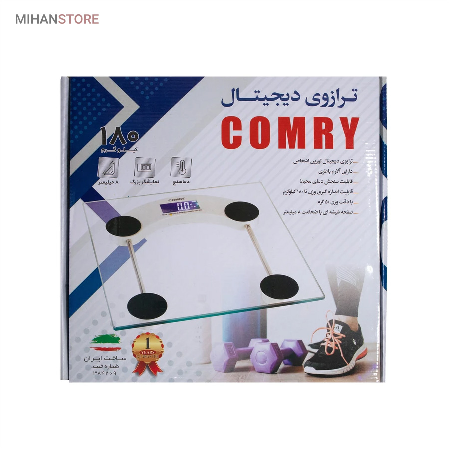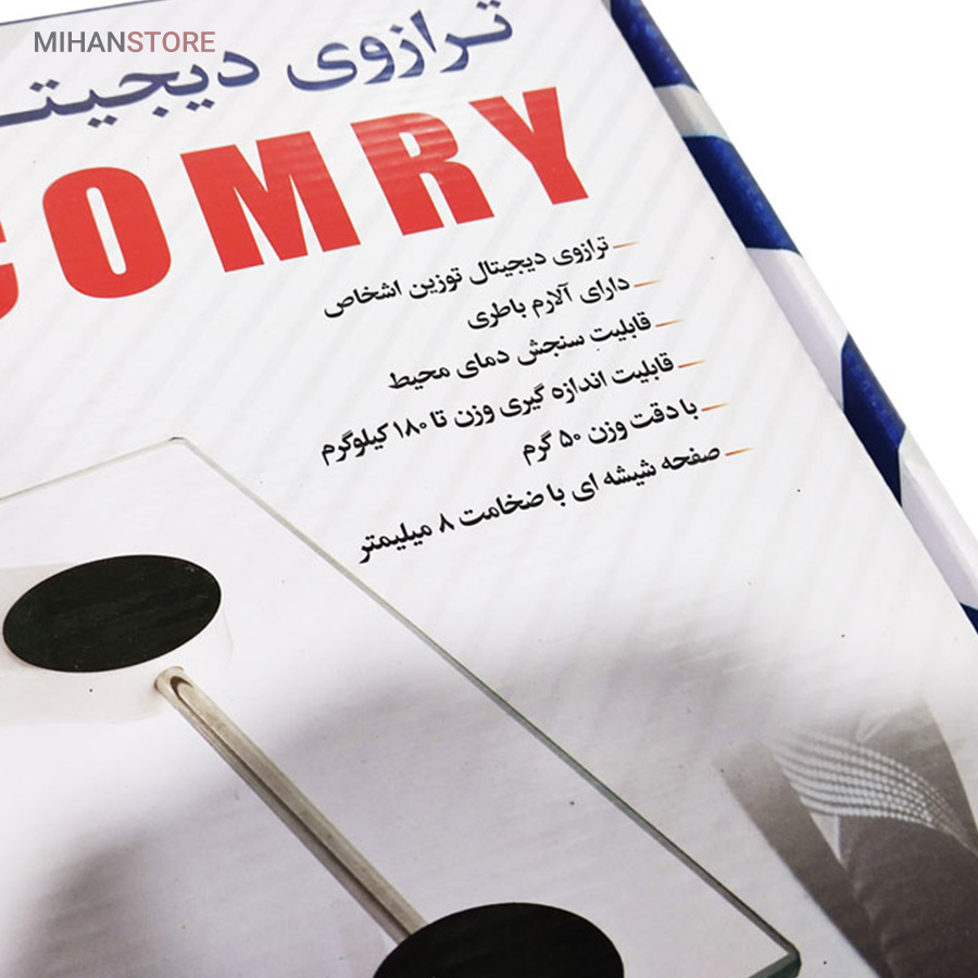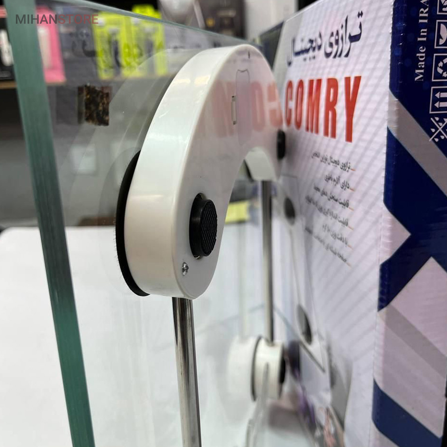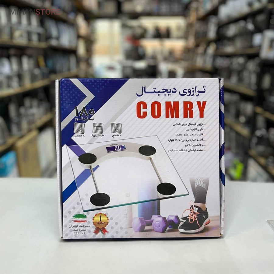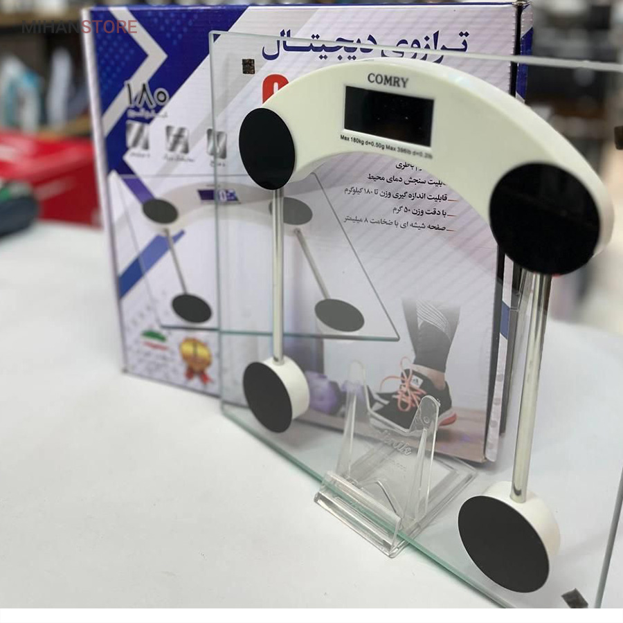 ترازو دیجیتال کومری شفاف از شیشه نشکن با ضخامت ۸ میلیمتر ساخته شدهاست. این ترازو دارای ظاهری ساده و مینیمال است و بر روی آن نمایشگر الایدی تعبیه شده و وزن شما را کاملا خوانا نمایش میدهد. چهار دایره مشکی رنگ بر روی بدنه شیشهای بیرنگ این ابزار، ظاهر آن را از یکنواختی خارج کردهاست. این ترازو از نوع جدید ترازو وزن کشی کومری هست که نسبت به سایر ترازو ها در بازار از دقت بسیار بالایی برخوردار هست.